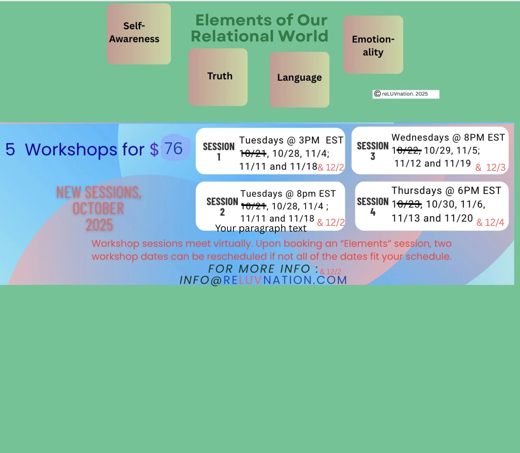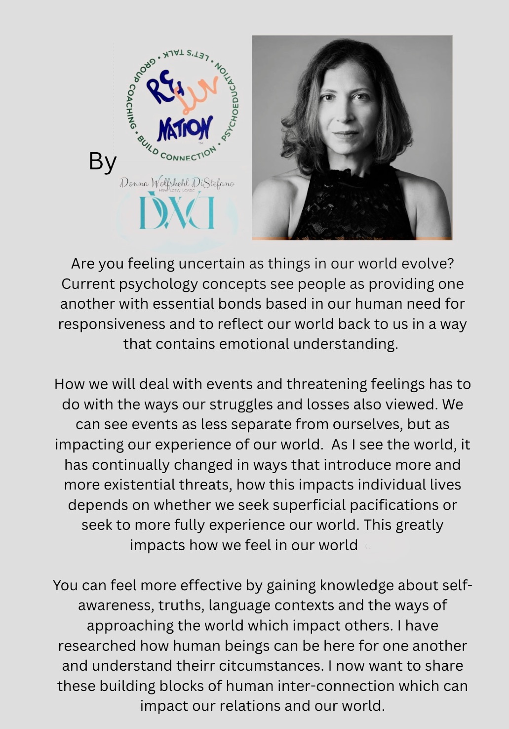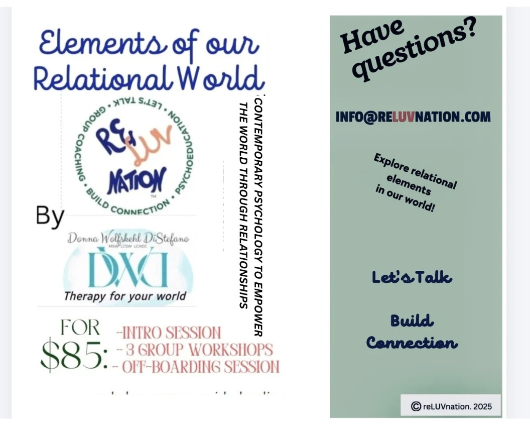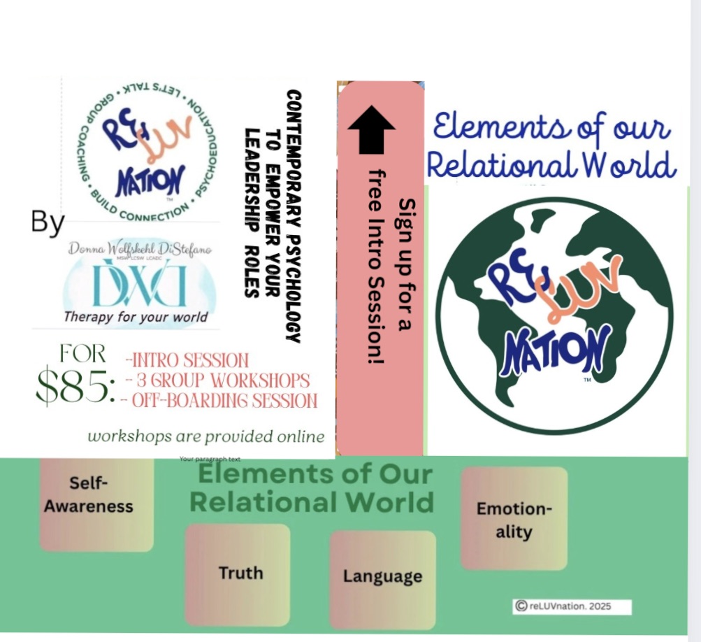 reLUVnation, LLC provides psychoeducation, leadership and organizational coaching based in contemporary relational principles. We focus on the personal and societal impacts of relational experiences. Coaching and Psychoeducation are goal and learning-oriented services. In contrast to psychotherapy, developed out of the effort to cure mental and emotional unease, the coaching tradition stems from a sports background and is skill-based. While psychotherapy traditionally involves interpretation for which there are different approaches, and for which a competent therapist can explain their approach and is aware of how they are applying their approach.